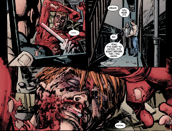 Poucas são as sequências de ação neste roteiro focado no diálogo (afinal, é Bendis escrevendo), no qual o silêncio pode significar mais do que palavras e a dissimulação é uma constante. Isso não significa que o enredo não ande para a frente. Muito pelo contrário: a história sempre toma rumos surpreendentes, como o surgimento de um novo Demolidor.