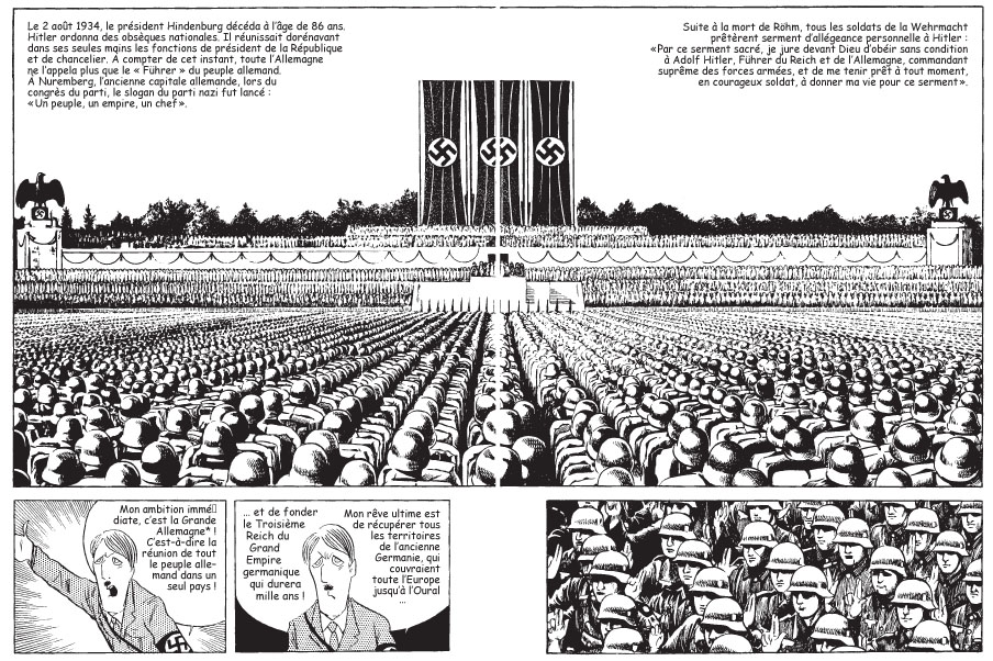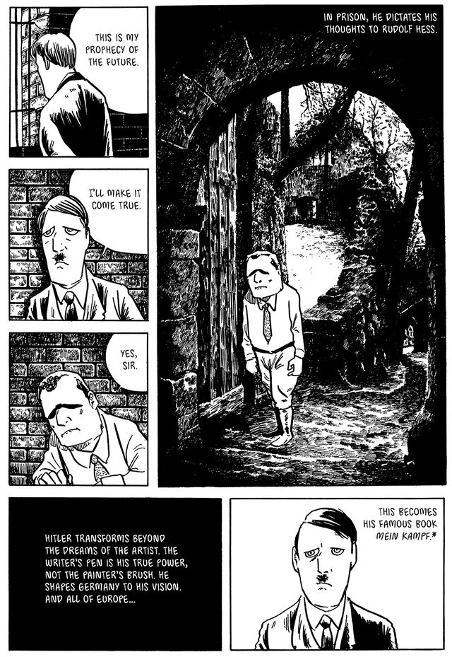 O começo do quadrinho é bastante poderoso. Várias imagens aleatórias são justapostas, incluindo judeus se escondendo em um sótão, pilhas de corpos num campo de concentração, um caminhão da SS se esgueirando pelas vielas de Paris, um comício nazista reunindo multidão que se perde de vista. Antes de entrar nos detalhes de sua vida, vemos os efeitos práticos da existência do führer no mundo ao seu redor. A partir daí, somos mandados de volta para Viena, em 1908, quando ele ainda era adolescente.