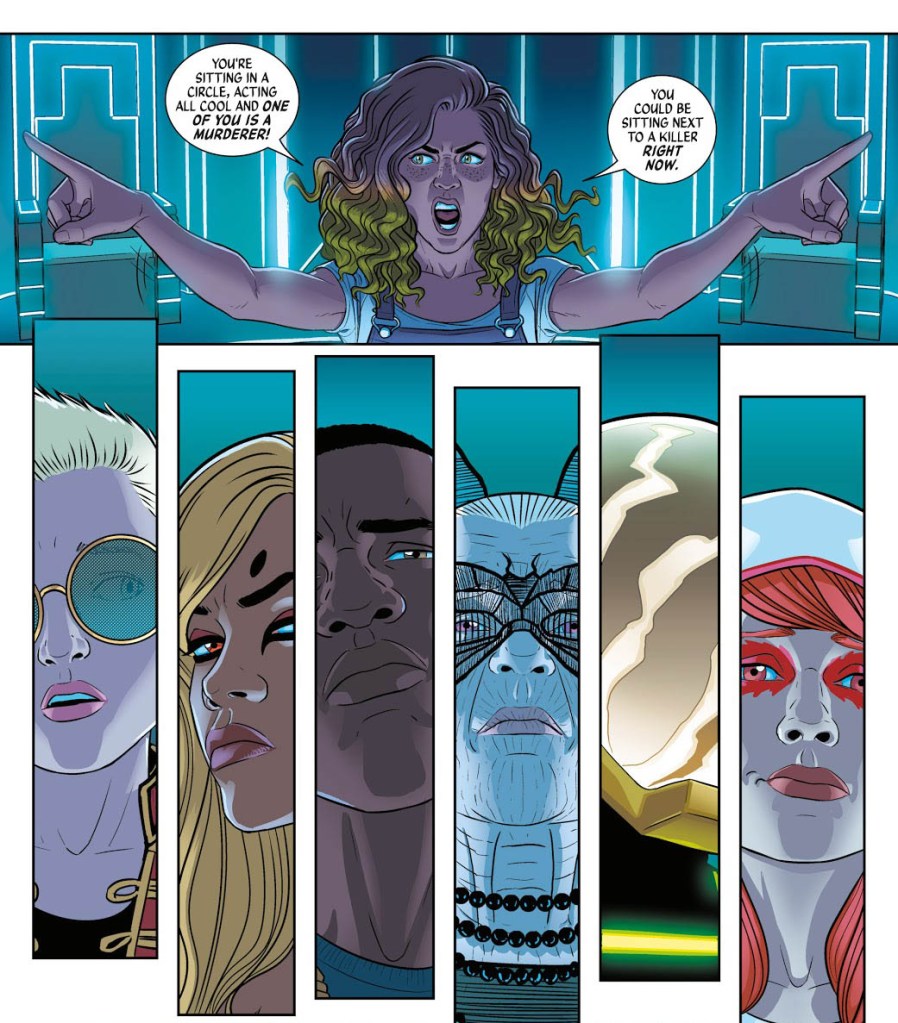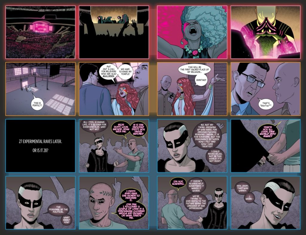 A soma disso faz o começo de WicDiv ser… estranho? Como disse, é preciso tempo pra entender que a obra atua em dois níveis – o do roteiro e o do subtexto. Muitas das indagações e reflexões estão subentendidas em ações dos personagens, em cenas e falas aparentemente banais. Esses são os motivos de o roteiro parecer frio, estéril, quando, na verdade, muita coisa já está em andamento sem o leitor perceber.