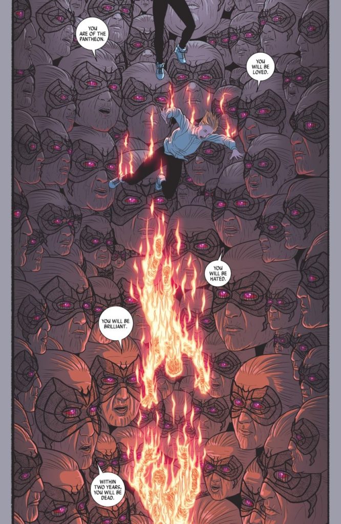 Para as referências ficarem próximas do mundo real, McKelvie usa em alguns desses personagens a estética, quando não o rosto, de ídolos da música. De David Bowie a Prince, passando por Daft Punk, Rihanna, Kanye West e Florence Welch, todos os homenageados são responsáveis por renovarem a cultura jovem em seus respectivos períodos. Esse expediente distrai um pouco, admito, mas aproximar o gibi do culto à personalidade existente no cenário musical reforça as principais mensagens da série.