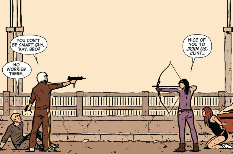 Vários gibis de super-heróis pegam aqui e ali particularidades do noir. Mas poucos as reinventam como a passagem de Frank Miller pelos roteiros e desenhos da revista do Demolidor, ali no começo dos 1980, tendo Klaus Janson na função de arte-finalista. Miller leva o herói cego Matt Murdock ao submundo da Cozinha do Inferno, em Nova York, para fazê-lo perceber a realidade da cidade grande, incluindo toda a sujeira das ruas, os sem-teto, o crime organizado. Em alguns momentos, ainda dá pra perceber a ingenuidade da época, principalmente nas primeiras histórias e nos recordatórios que recapitulam eventos anteriores, porém a obra é um marco na noção de que quadrinhos de massa não precisam ser infantis o tempo todo. Já a fase do roteirista Matt Fraction à frente do Gavião-Arqueiro é um mix de referências: cinema policial dos 1970, cultura popular da década passada e design gráfico minimalista – este último encontrado na arte de David Aja. O trabalho, que está na briga direta pelo troféu de melhor HQ de super-herói dos últimos vinte, trinta anos, chega a fazer uma releitura psicodélica de O Perigoso Adeus (filme mencionado mais pra cima), quando Kate Bishop, a Gaviã-Arqueira, abre um escritório de investigação em Los Angeles.