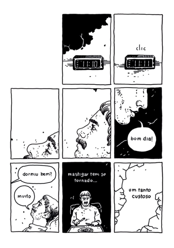 Os desenhos sem requadro seguem como a principal marca estilística da quadrinista. E, cada vez mais, ela acrescenta soluções visuais pra ajudar esse tipo de composição – como a sobreposição de imagens em close e em segundo plano. E uma cena em especial se destaca, na qual dois personagens são gradualmente iluminados por faróis de carro. As pesadas sombras feitas de lápis dão lugar a formas com contornos bem soltos: é o “momento da verdade”, quando a realidade se choca com o fantástico, e todas as intenções (da artista e do quadrinho) passam a fazer sentido.