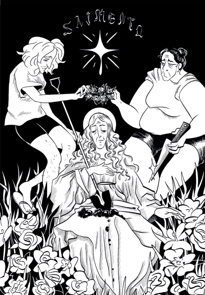 Existe uma iconografia religiosa que perpassa as páginas – um halo saindo da cabeça de certo personagem, uma citação ao Evangelho de São Lucas parafraseando a “parábola do filho pródigo”, uma referência imagética à cruz de Cristo. Afinal, é um enredo sobre salvação: o narrador Jonas (mesmo nome do profeta bíblico engolido por uma baleia), tomado pelo vazio existencial, atende ao chamado do misterioso Armand para imolar-se, com o objetivo de proporcionar um momento de êxtase, mesmo que fugaz, a si e ao próximo.