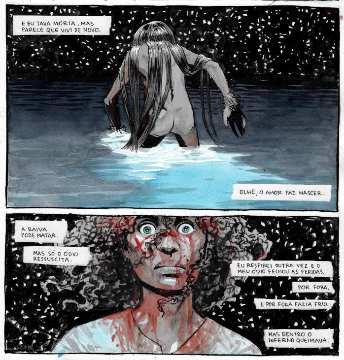 O épico cangaceiro Carniça e a Blindagem Mística, de Shiko, ganhou seu segundo volume, A Tutela do Oculto (independente). Indo mais fundo na relação das personagens com entidades sobrenaturais, a HQ encanta por ter o que contar em diferentes níveis: no objetivo (a história de banditismo e vingança inspirada em diversas situações reais) e no subjetivo (o subtexto a respeito da emancipação feminina e a luta contra a opressão). Pra deixar ainda melhor, as aquarelas de Shiko nunca estiveram tão belas. O italiano Gipi é mais um a escolher esse método de pintura – e não só ele. Em Umahistória (Veneta), ele desenha com diversas ferramentas, da aquarela à esferográfica e nanquim, para refletir a mente estilhaçada de um escritor doente. Memórias de antepassados que se fundem aos fatos do presente, ficção que se reproduz na realidade, tudo representado por metáforas visuais de lirismo único – não existe autor igual a Gipi em nenhum canto do mundo. Naturezas Mortas (Faria e Silva), do belga Zidrou e do espanhol Oriol, também aposta em uma estética de pintura para emular os quadros do catalão Vidal Balaguer, considerado um dos precursores do modernismo local. O roteiro gira em torno dos últimos momentos do pintor antes de seu desaparecimento no fim de 1899. Com toques de realismo mágico, é uma ode à criação artística como refúgio de um mundo duro.