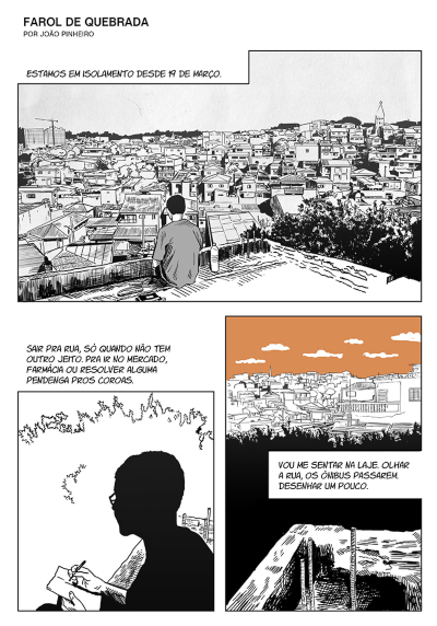 O morador da periferia das grandes cidades brasileiras tem mais em comum com o cidadão japonês pós-Segunda Guerra do que aparenta. Em maio de 2020, João Pinheiro fez a HQ Farol de Quebrada para o site do Instituto Moreira Salles – leia na íntegra aqui. Num estilo diário, com texto franco em primeira pessoa, ele conta os perrengues enfrentados pela quebrada paulistana durante o início da pandemia. O formato nem era novo, pois outros artistas já narravam a rotina de confinamento e o medo de um vírus mortal. Mas a estética escolhida chamou a atenção: Pinheiro desenha um verdadeiro gekigá suburbano verde e amarelo, roubando (conscientemente) o visual de um clássico da década de 1960 feito por Tsuge Yoshiharu para criar (talvez inconscientemente) um paralelo entre indivíduos distantes no tempo e espaço, porém semelhantes na essência.