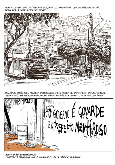 Farol de Quebrada, reproduzida ano passado em Depois Que o Brasil Acabou, livro da Veneta compilando histórias do autor, se inspira em Nejishiki, a obra que moldou o quadrinho moderno ao inserir uma então inédita abordagem subjetiva à mídia. Enquadramentos angulosos, uso de um preto profundo, rostos encobertos por sombras, tons alaranjados aqui e ali, hachuras dando textura ao mundo desenhado: a estética do gekigá (e do mangá alternativo dos 1960/70) casa bem com a realidade da periferia nacional. Tem espaço até para um aceno ao aspecto surreal do gibi de Tsuge – carros importados e aviões da elite flutuam por cima dos barracos, como se colocassem quem vive nas vielas e morros em seu devido lugar.