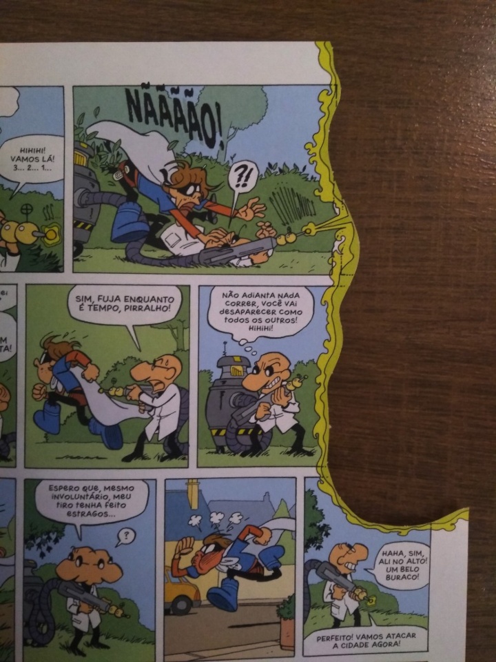 Outro clássico francês da metalinguagem saiu por aqui não faz muito tempo, pela Nanabooks. Imbatível é um super-herói que só poderia existir nos gibis: por saber que está numa HQ, ele soluciona crimes sem suar, andando por entre os quadros das páginas e se antecipando aos movimentos dos bandidos. São várias gags de humor baseadas nessa estrutura – algumas absurdamente criativas, outras nem tanto, todas trazendo frescor ao gênero. Até que, em determinada história, o ajudante de Imbatível impede um vilão de aniquilar a cidade com um canhão de laser. O resultado é uma página “queimada”.