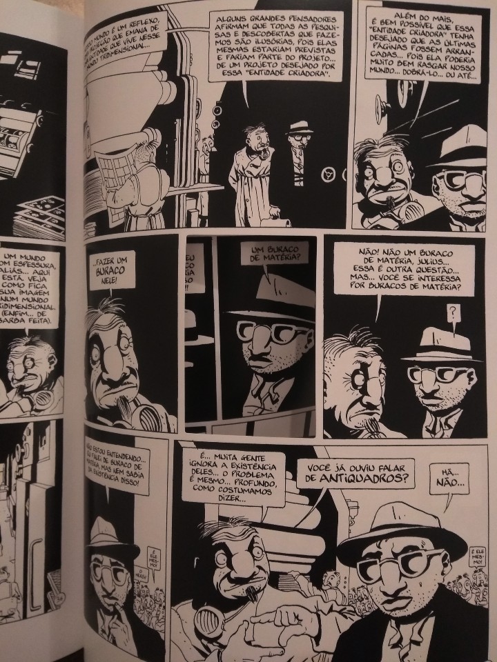 A coisa muda quando o leitor precisa fazer outras coisas para desfrutar a obra. Voltemos à Julius Corentin Acquefacques. Lançada ao longo das décadas de 1990, 2000 e 2010, a série mostra as desventuras do protagonista ao descobrir que vive dentro de um gibi. Viagem metalinguística das boas – melhor ainda por não se levar a sério, tratando o assunto com um humor pra lá de elegante. Acontece que a temática também é abordada fisicamente em cada volume. Mathieu recorta quadros, monta dobraduras, cola páginas umas nas outras, começa uma história pela página 7, faz o leitor virar um dos livros de cabeça pra baixo etc. E todas as soluções existem como requisito de roteiro, não são meros truques, nem maneirismos pra chamar a atenção.