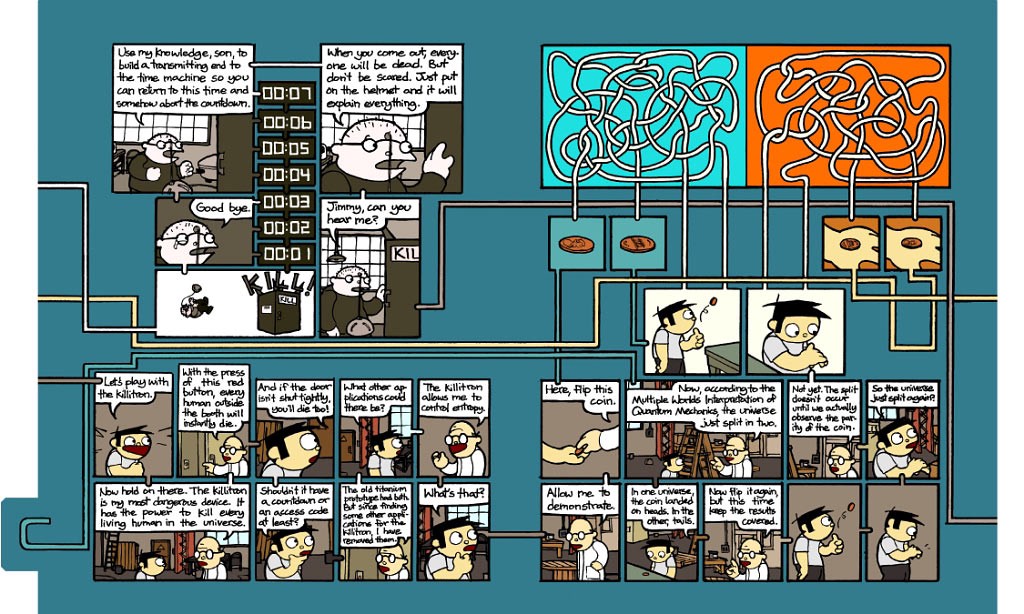 Um livro pode comportar uma biblioteca? No caso de Meanwhile, sim: a obra oferece 3.856 possibilidades de história diferentes, graças a um sistema que permite ao leitor escolher o caminho da trama. A cada quadro, linhas indicam para onde seguir, e você o faz de acordo com sua vontade – quer que o protagonista faça o teste de um aparelho que lê mentes, uma máquina do tempo ou um dispositivo do juízo final? Cada escolha te levará a quadros e páginas diferentes, fazendo a leitura voltar, se adiantar, subir, descer… O conteúdo é uma aventura juvenil para todas as idades, inspirada nos games de “ficção interativa” dos anos 1980/90 – e vale dizer que a quadrinista Lovelove6 já produziu um jogo nesses moldes, o Labirinto do Necromante. Existe uma versão game de Meanwhile, que em tese facilita a interação, mas duvido ser mais divertido que ficar virando as folhas pra lá e pra cá.
