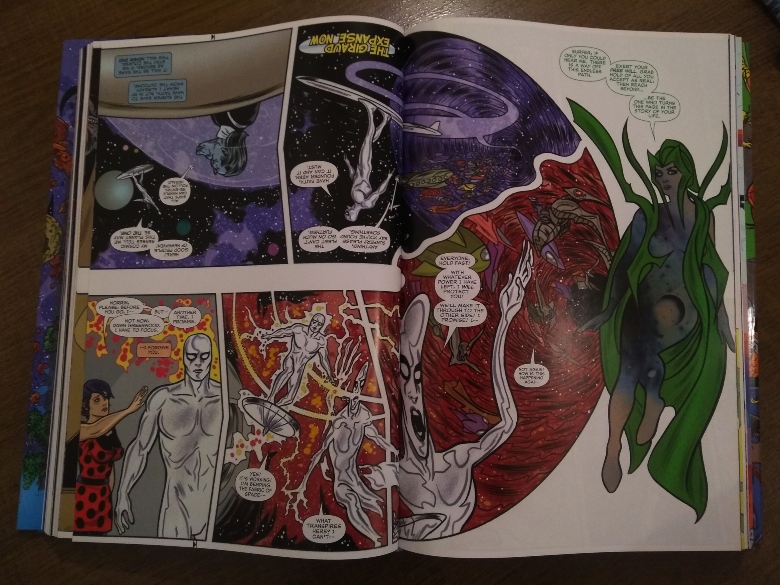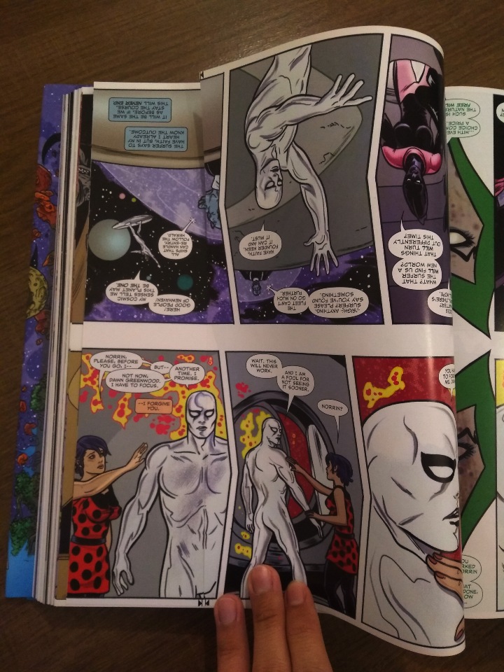 A fase de Slott e dos Allred no Surfista Prateado é dos grandes quadrinhos de super-herói da década passada: uma verdadeira ode à ficção científica em pequenos enredos fechados, cheios de aventura, emoção e personagens em processo de autodescobrimento. A história Felizes Para Nunca, publicada lá fora na edição mensal número 11 (e, no Brasil, no encadernado Surfista Prateado – Últimos Dias – Volume 3), se baseia na teoria matemática da fita de Möbius, criada no século 19. Esta matéria da BBC Brasil explica os detalhes da teoria, mas vale resumi-la. A fita tem a forma semelhante à do número oito deitado e representa um objeto com apenas um lado, sendo impossível determinar sua parte de cima, de baixo, de dentro ou de fora. Pensando nisso, o roteiro coloca o Surfista num looping espacial, um lugar infinito sem saída – e a situação só pode ser resolvida pelo leitor: ao dobrar uma página sobre a outra, encaixando as marcações presentes nos rodapés, os personagens enfim se livram da prisão na qual se encontravam.