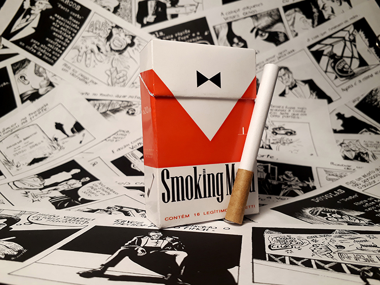 Difícil achar um formato de gibi mais inusitado que o proposto por Kash Fyre (pseudônimo de Oskar Dimitry Rizzo). Lembra-se de quando falei que as “HQs de interação física” não podem ser confundidas com “projetos editoriais diferenciados”? Pois Smoking Mata consegue ser ambos: 16 tiras, enroladas como cigarros e acondicionadas num maço, que podem ser lidas cronológica ou aleatoriamente. A grande sacada é notar como a ordem de leitura oferece novas nuances ao enredo noir – ler determinada tira antes de outra muda o entendimento das motivações.