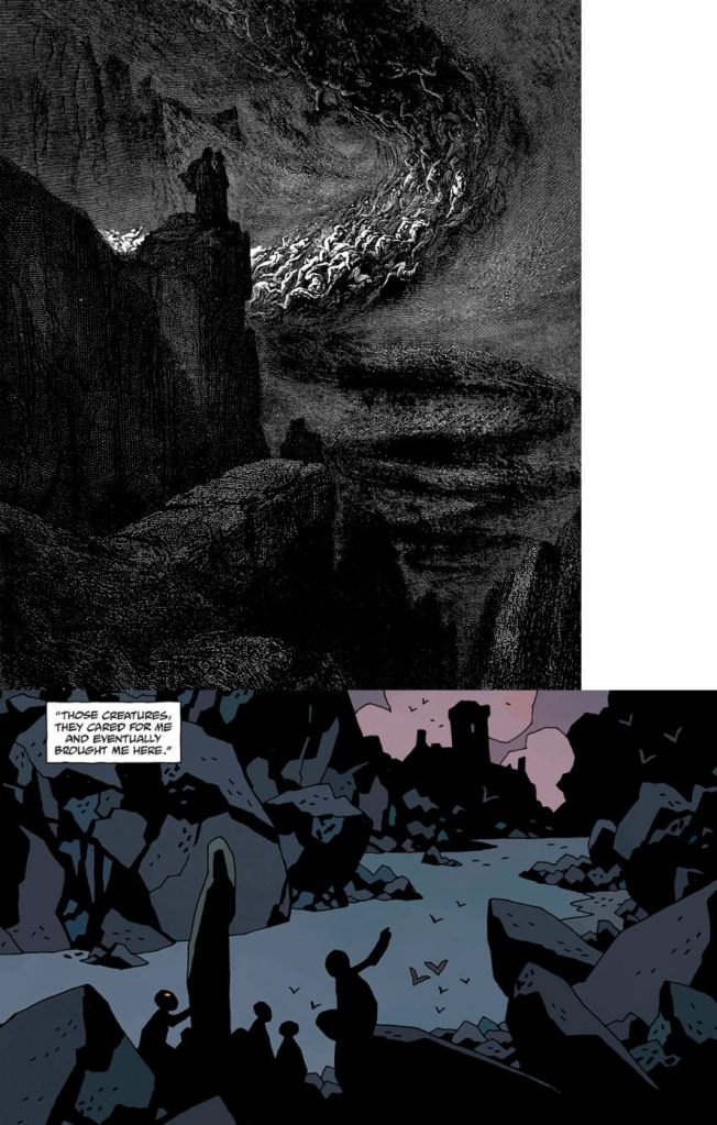 Mas a arte dessa obra bebe mesmo é de Gustave Doré, pintor francês famoso por ilustrar clássicos da literatura, incluindo A Divina Comédia. O senso etéreo, de mistério, desses desenhos é muito bem capturado por Mignola.