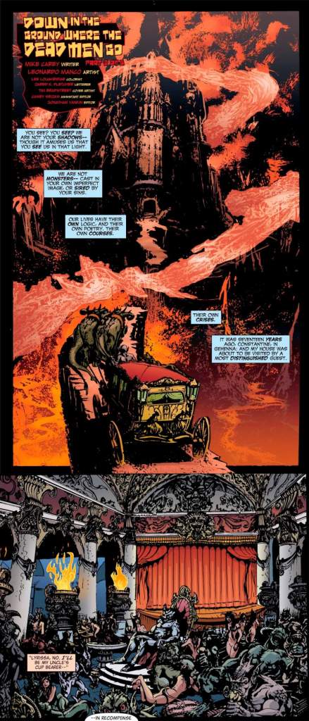Não poderia faltar menção à série Hellblazer, protagonizada pelo mago inglês John Constantine. Na fase escrita por Mike Carey e desenhada por Leonardo Manco, Constantine visita lá embaixo, um local cheio de chamas e luxo na mesma proporção, fazendo jus às pinturas do século 15.