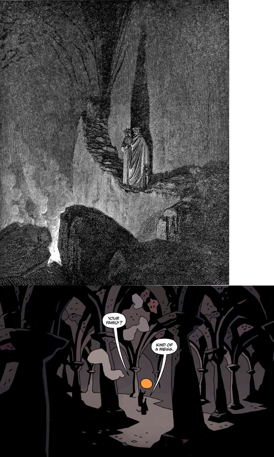 Mas a arte dessa obra bebe mesmo é de Gustave Doré, pintor francês famoso por ilustrar clássicos da literatura, incluindo A Divina Comédia. O senso etéreo, de mistério, desses desenhos é muito bem capturado por Mignola.
