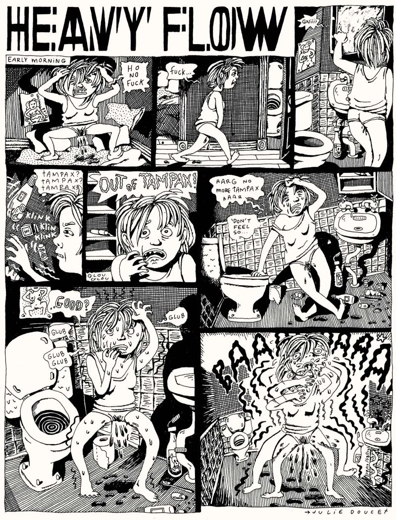 Vale, inclusive, pegar o exemplo de uma artista mulher que sempre esteve à frente de seu tempo temática e narrativamente, a canadense Julie Doucet. Ela cansou de tratar de temas tabu em sua revista Dirty Plotte; nem por isso se limitava a passar lição de moral, ou se colocar em posição defensiva, no que se refere a feminismo, abuso físico e psicológico, a vida em uma sociedade patriarcal etc. Pelo contrário, ia até as últimas consequências na mistura de biografia, ficção, metatextualidade e revolta – tem uma tira em que ela corta o pênis de um cara e usa o órgão ensanguentado pra pintar uma tela. Ter ido além das experiências pessoais faz de seu trabalho algo de vanguarda mesmo agora, trinta anos depois.