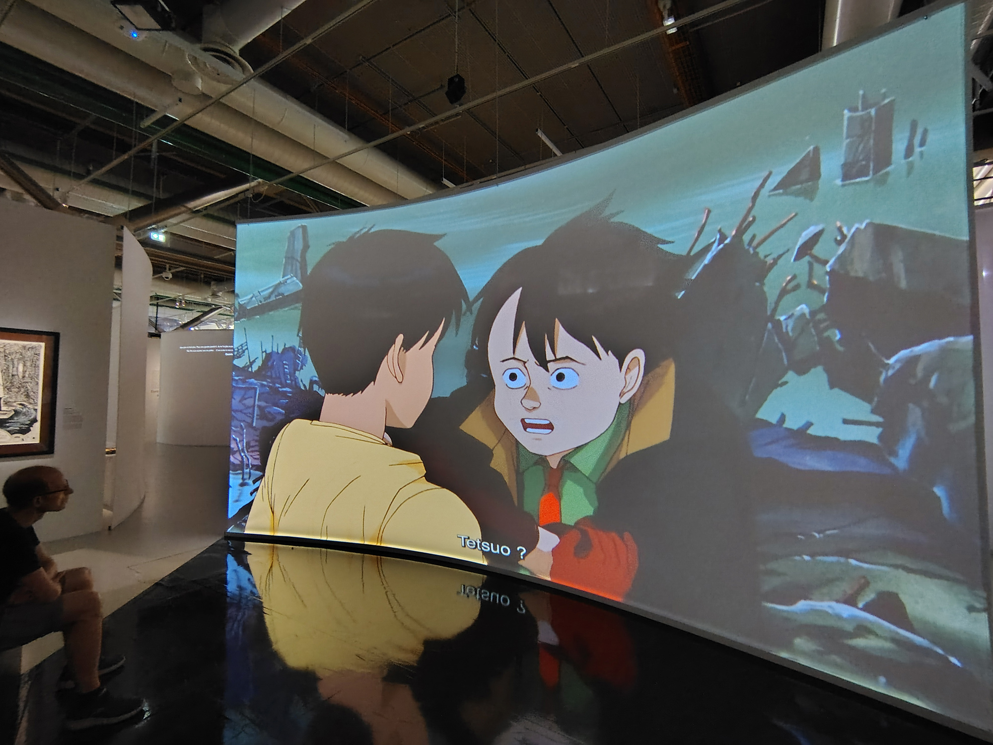 Painel com exibição de trecho da animação Akira (1988), de Katsuhiro Otomo