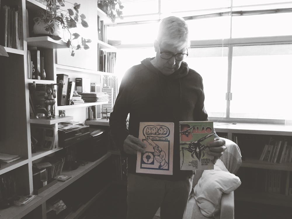 Mas uma coisa importante no processo da Balão eram as reuniões, sabe? Todo mundo se reunia semanalmente e mostrava coisas, trazia livro que tinha comprado e tal. Isso pra mim foi importante pra caramba. Pois esse negócio de desenhar na escola sempre foi um bicho estranho, uma coisa folclórica, “olha o cara que desenha”… É algo muito solitário e, de repente, tinha um monte de gente que desenhava junto. Eu ia até emocionado pra lá.