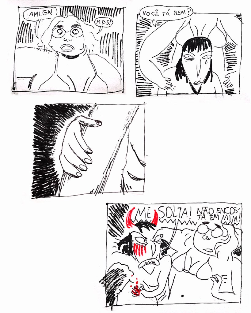 A produção de Mariana ainda não é extensa: além dos sapos, tive contato com apenas uma história dela, feita para a antologia Encrenca – Vol. 2, da Encrenca Coletiva (selo voltado para gibis de mulheres e pessoas trans). Numa única página, ela constrói um conto hilário, com ritmo perfeito para a piada revelada no último quadro, que desnuda a hipocrisia dos papéis sociais quando o assunto é sexo. Apesar da pequena amostra de suas habilidades, a artista apresentou uma visão instigante de como enxerga a mídia da qual faz parte.
