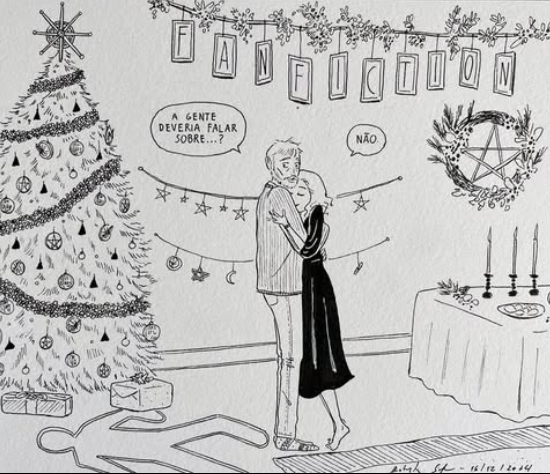 Escrevi a respeito do trabalho de Roberta aqui, ao comentar o primeiro volume de sua série FanFiction, cujo conceito é singular: são fanfics (inventadas pela autora) sobre um seriado policial da TV norueguesa (também inventado pela autora), no qual personagens presos em intrigas românticas tentam solucionar mistérios. Tanto no volume impresso lançado ano passado como nas tiras online, ela utiliza personagens recorrentes para construir um humor suave, misturando clichês de histórias açucaradas a signos, igualmente clichês, dos gêneros do suspense e do terror.