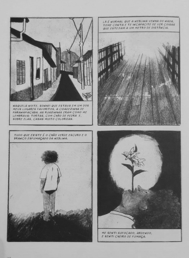 Em Lírio, publicado no primeiro número da antologia Harvi, do Selo Harvi, novamente o protagonista (um jovem em processo de mudança de casa, sendo ajudado pelo namorado) ganha suas feições, embora tenha outro nome. Sonhos se misturam ao “real”, em meio a imagens que talvez aconteçam somente na mente do rapaz. As memórias de uma pessoa (ou as do próprio autor) e a superação do passado são a matéria-prima de Nascimento, como visto numa HQ em que conversa com a mãe por telefone, tentando fechar feridas abertas – e os quadros sem cenário vão ganhando mobília, conforme algum entendimento acontece entre os dois. Nuances como essas só fortalecem nossos gibis.