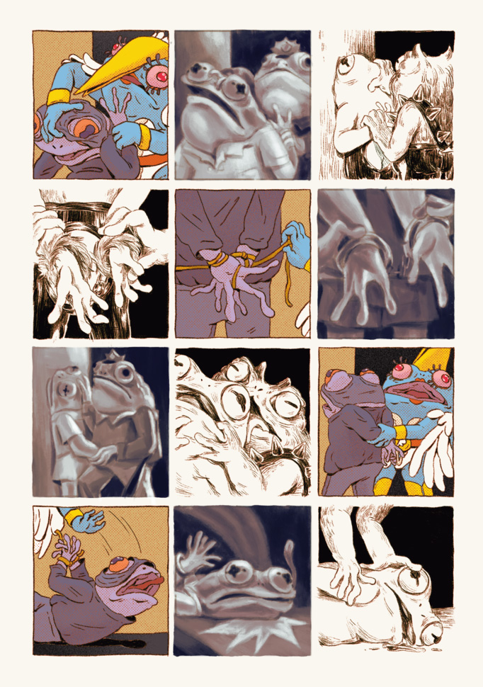 Se Kainã Lacerda talvez fosse o único quadrinista brasileiro a desenhar atos libidinosos envolvendo animais antropomorfizados, agora não está sozinho na empreitada. Marina Schenkel imaginou sapos fetichistas amantes de BDSM para seu livro Love can hurt, uma espécie de estudo sobre o desejo humano protagonizado por anfíbios, desenhados com diferentes técnicas e gradação de cores.