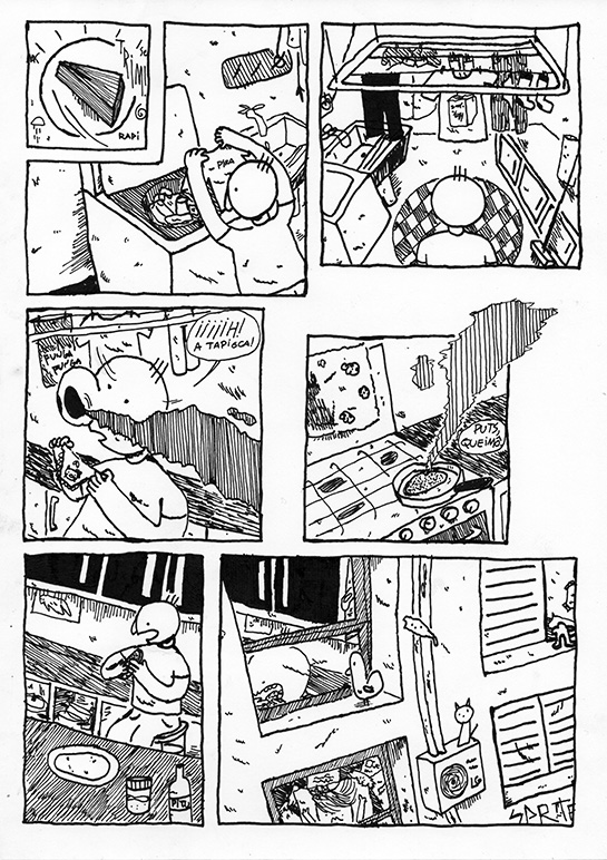 Adolescente prodígio, assim como os irmãos Ramos foram um dia, Sebastião Dojcsar surpreende pela quantidade de trabalho que já colocou na rua: a trilogia de zines Corpo de Tinta (uma distopia em que o pixo salva o dia), a série Bueiro (compilando desenhos, HQs, colagens e abstrações) e a graphic novel de cem páginas Beto e o Interlux (publicada pelo selo Pé-de-Cabra, com crítica minha aqui). Isso sem falar na capacidade de empreendedor: sua minieditora, a Piranhas, lança artistas parceiros. Parece muita coisa, e é – ainda mais se levarmos em conta que Dojcsar tem nem dezoito anos de idade. Imagina a quantidade de gibi que o rapaz terá produzido daqui a uma década?