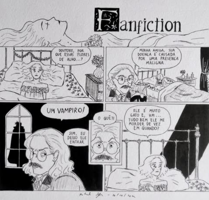 Escrevi a respeito do trabalho de Roberta aqui, ao comentar o primeiro volume de sua série FanFiction, cujo conceito é singular: são fanfics (inventadas pela autora) sobre um seriado policial da TV norueguesa (também inventado pela autora), no qual personagens presos em intrigas românticas tentam solucionar mistérios. Tanto no volume impresso lançado ano passado como nas tiras online, ela utiliza personagens recorrentes para construir um humor suave, misturando clichês de histórias açucaradas a signos, igualmente clichês, dos gêneros do suspense e do terror.