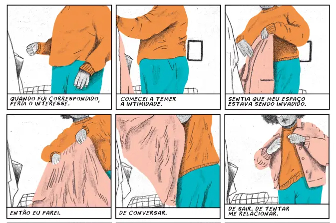 Um gênero bastante usado no cenário independente é a autobiografia. Eu acredito que nem toda vida é interessante o bastante para virar arte – vários autores não concordam com isso. Porém, Gustavo Nascimento traz frescor a esse tipo de história inserindo nele um nível de ficção, de relato subjetivo. Em um quadrinho feito para a revista Cláudia, por exemplo, ele se desenha num quarto, trocando de roupa para sair, enquanto os recordatórios versam sobre a dificuldade para voltar a conhecer pessoas após um término de relacionamento. Acontece que a obra acompanha uma reportagem sobre tal tema – estaria ele, então, falando a respeito da própria experiência ou se colocando como personagem num cenário hipotético?