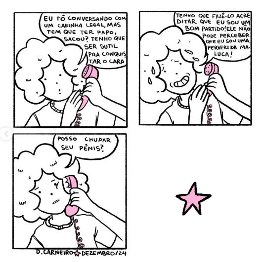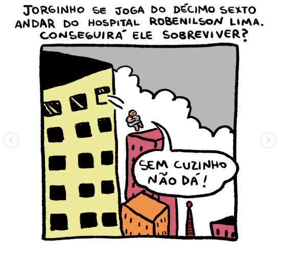 Ouvi falar dessa brasiliense durante a CCXP 2023, quando apresentou o personagem Jorginho, um homem com estatura e feições de criança que só quer gozar a vida em meio a mulheres e entorpecentes. Desde então, Duda fez algumas das melhores tiras de relacionamento a serem encontradas no Instagram. Sem querer indicar comportamento ou vender empoderamento na busca por likes, a autora brinca de forma autodepreciativa com a ideia de “universo feminino”. Ela está muito mais próxima da anarquia de grandes quadrinistas mulheres esquecidas pelo tempo, como Joyce Farmer e Lyn Chevli, fundadoras da seminal antologia norte-americana Tits & Clits, do que de autoras nacionais famosas por essa temática.