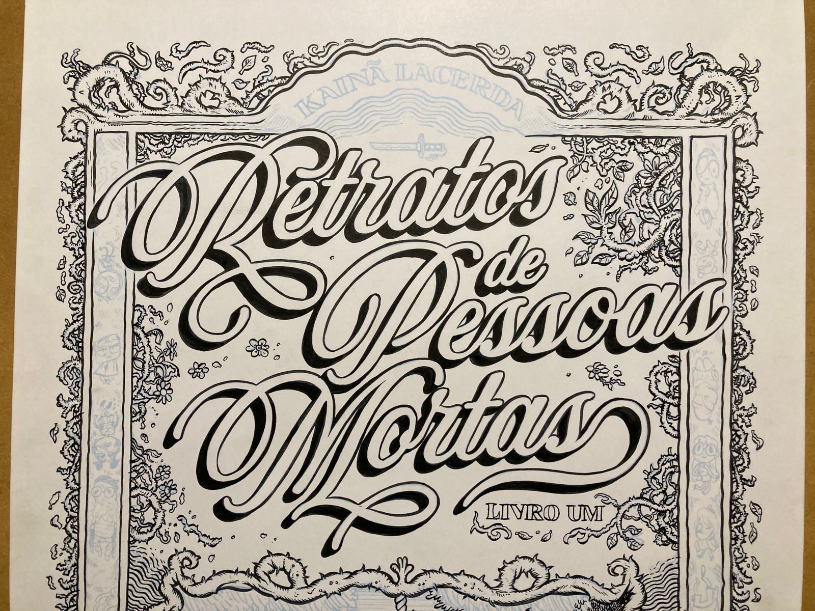 A capa do Retratos eu fiz em A3 porque é muito detalhezinho. Se tivesse de fazer em A4, eu ia ter de pegar uma caneta bem pequenininha, ia ser horrível, sabe? É legal você trabalhar num tamanho maior. O único lance de eu trabalhar em A4 é porque posso imprimir em casa. Em A3, seria só em gráfica.