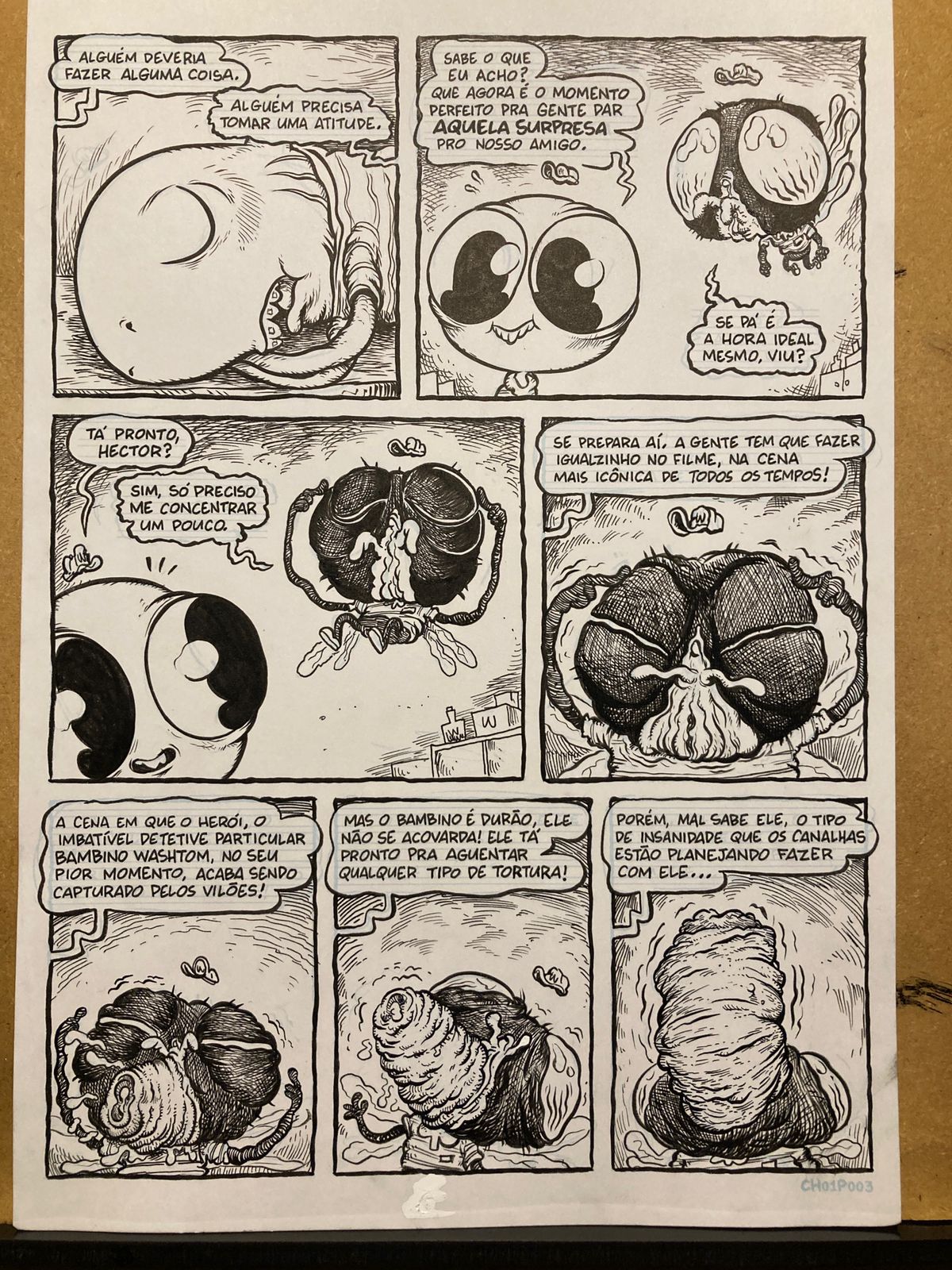 Quando eu era bem pequenininho, eu fazia quadrinho para mim. Fazia um quadrado, ou só dividia a folha. Não tinha a genialidade de fazer o gutter no negócio. E ia desenhando o quadro 1, o quadro 2… Então, na hora de fazer as thumbs eu vou fazendo meio assim – só que, claro, eu já tenho uma ideia do que vai acontecer naquela página. É mais pra eu organizar tudo ali. Às vezes eu faço, tipo, cinco páginas e vejo que tá uma merda [risos]. Pego e jogo tudo fora, faço de novo – nem sempre, mas acontece.