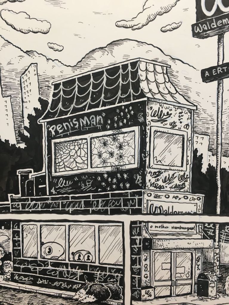 Eu não sei quem ou porque alguém iria ler ou gostar das minhas paradas [risos]. Sempre que alguém vem falar comigo é uma surpresa – e é sempre um cara normal, nunca é um tipo bizarro. É um cara normal que lê Marvel também, mas que gosta bastante das minhas coisas. É muito difícil eu pensar num público específico porque, na cena nacional de quadrinhos, a gente tem alguns subgrupos, e acho que nunca consegui me encaixar em nenhum. Tem a galera meio MSP, meio Turma da Mônica, que faz umas paradas fofinhas; o pessoal do meme, tiras de internet fast food pra serem compartilhadas no Instagram e imediatamente esquecidas; tem também gente dos quadrinhos mais poéticos, gente que faz umas paradas alternativas ou experimentais; e tem o mais próximo do que seria a minha coisa, o “quadrinho podre”. E eu nem sei se o que eu faço entra como “quadrinho podre”, pois considero essa vertente uma parada mais nojeira, menos fetichista – e o meu quadrinho tem umas paradas muito extremas, supersexuais. Eu coloco também muito diálogo, muito texto, um carinha conversando com outro durante páginas e páginas. Então, é difícil imaginar quem é a pessoa que vai querer ler uma parada imunda, horrível, como a minha. É surpreendente ter alguém que goste. E eu tento conscientemente deixar meu quadrinho o mais interessante possível pra essa galera.