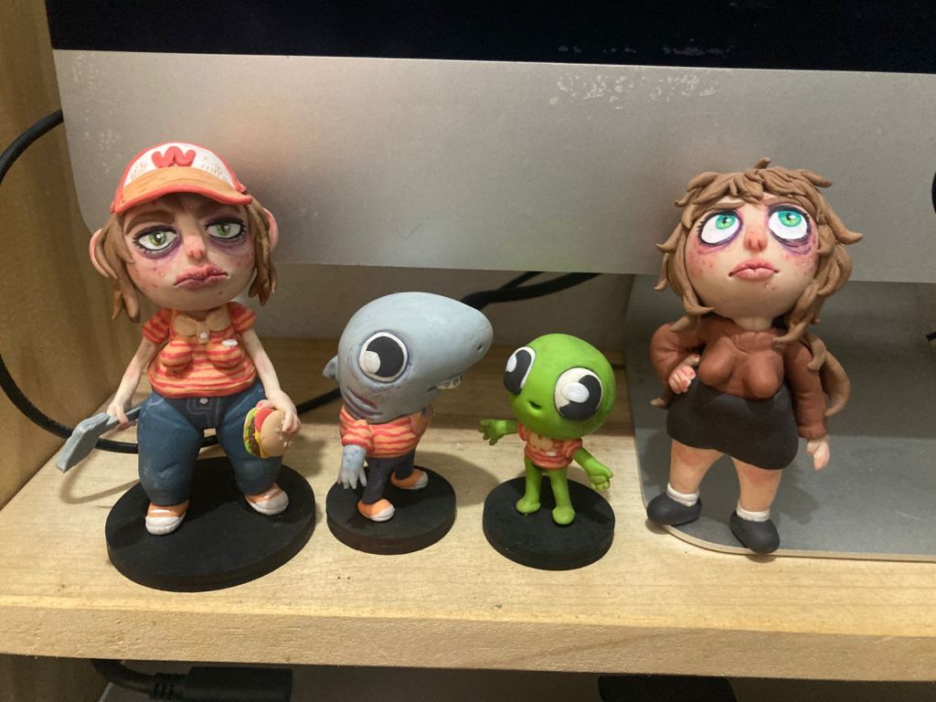 Às vezes polymer clay, às vezes biscuit. Eu queria fazer pra reproduzir mesmo. Mas aí vira um job. Eu gosto de estar sempre experimentando. Gosto de pintar. Sempre compro todos os materiais de arte que o meu dinheiro consegue. Quando mais novo eu pintava quadros – tem um que é horrível e minha mãe tem na parede até hoje.