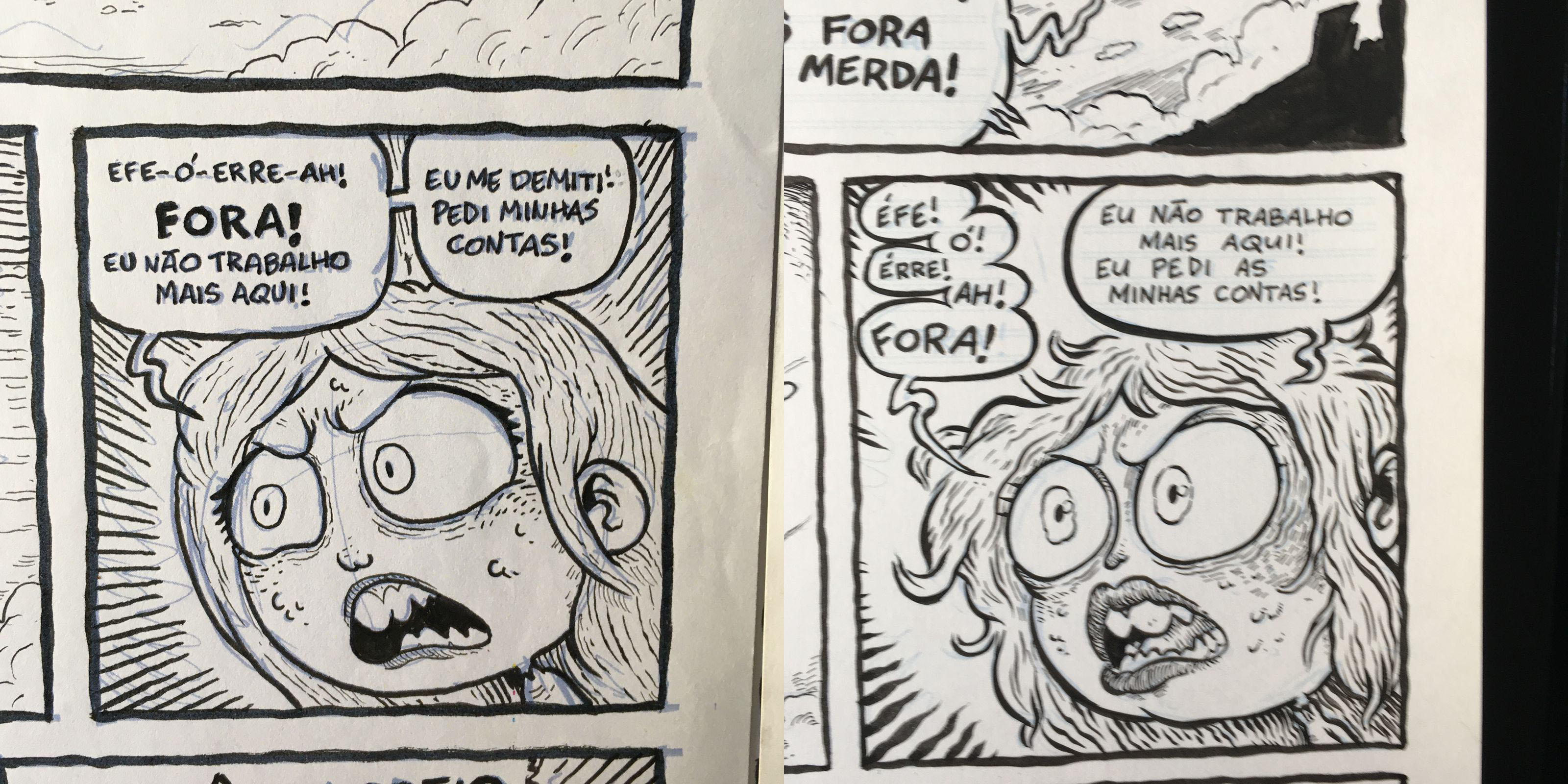 Mas isso eu faço no iPad porque é muito mais fácil. Se tivesse de fazer no formato tradicional, tem todas as coisas chatas de desenho, medir o tamanho do gutter, desperdiçar papel, fazer linhas pro texto. E ainda teria de usar uma mesa de luz grande – eu tenho uma pequenininha. No computador, eu economizo horas e horas de trabalho nessa parte.