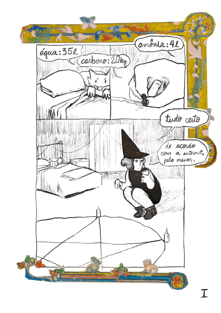 Nossa, como eu fazia tantos quadrinhos? [risos]. Então, em 2016, 2017, eu trabalhei num desenho animado chamado Vivi Viravento, E a gente fazia muita coisa de recorte, colagem, né? E eu acho que fiquei com essa pira, de usar fotografia, banco de imagem. Ao mesmo tempo gosto muito de iluminura, coisa medieval. Então, eu devia ter essa vontade de incluir isso em algum lugar.