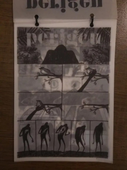 Naquela época, eu desenhava muito em papel vegetal. Eu lembro de quando eu desenhei esse quadrinho, na prancheta. Quando escaneei, odiei, achei que ficou com muita textura, não ficou legal. Aí refiz tudo no computador. Não acho que devia ser assim, idealmente – esse tipo de projeto você precisa pensar desde o início, né? Então, usar o papel vegetal foi um acidente. Não era uma história pensada pra ter transparência, mas eu vi ali e pensei que funcionava.