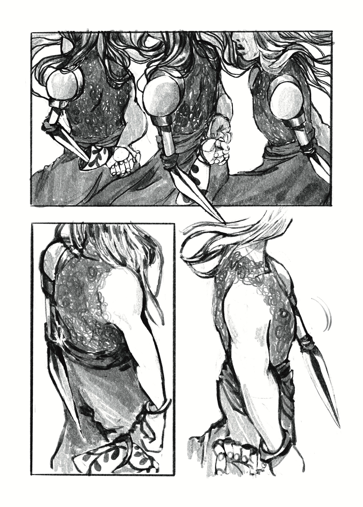 Eu sempre odiei fazer roteiro da forma convencional. Acho que é muito difícil descrever verbalmente o que tá acontecendo na imagem – é mais fácil pegar e desenhar. Prefiro escrever um argumento, pra ter a ideia geral, e depois destrinchar nas páginas, já ir pros thumbnails.