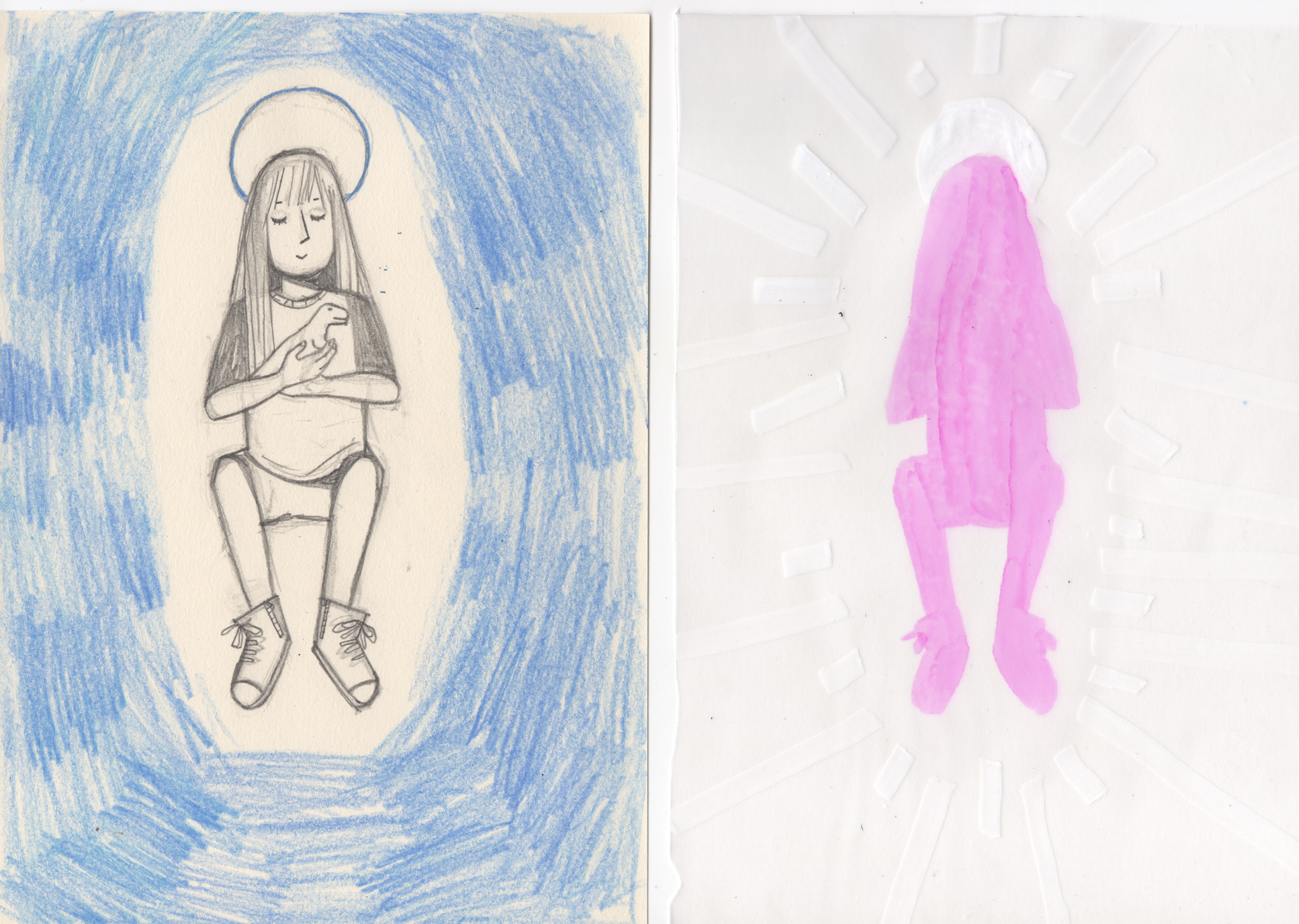 Eu acho legal rever, sabe? Até porque tô vendo aqui as coisas e nem lembrava que existia isso tudo. Mas imprimir demanda dinheiro e esforço. Aí você tem de expor na sua mesinha da feira, e no fim é uma coisa que não condiz mais com quem você é, sabe? Você não é mais aquela pessoa, aquele traço. Não sei se faz sentido.